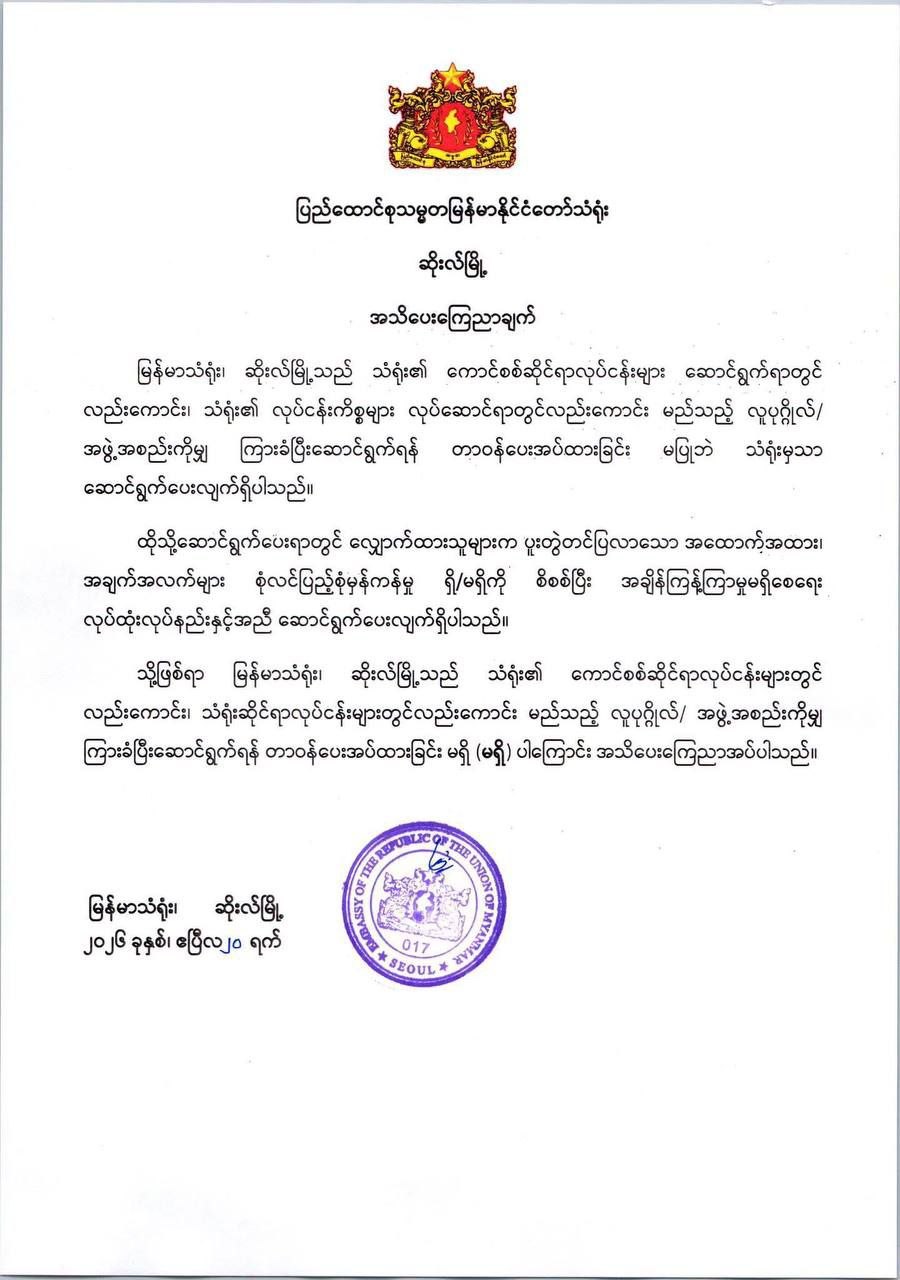ကိုရီးယားနိုင်ငံ၊ ဆိုးလ်မြို့ရှိ မြန်မာသံရုံးအနေဖြ...