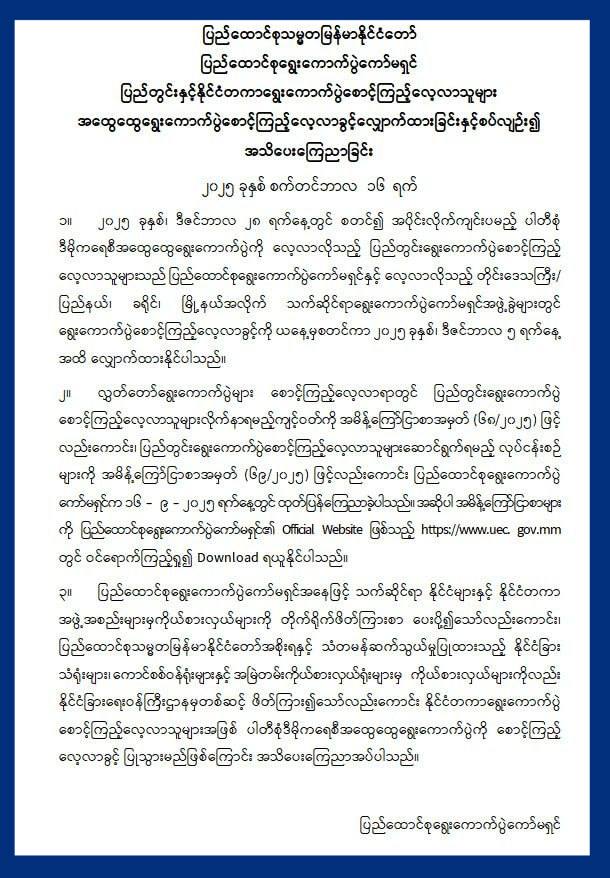 Read Moreပြည်ထောင်စုရွေးကောက်ပွဲကော်မရှင်က လာမည့် ဒီဇင်ဘာလ...