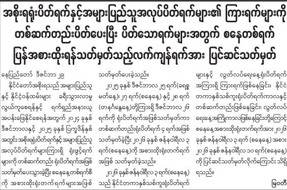 ၂၀၂၆ နှစ်သစ်ကူးရုံးပိတ်ရက်အဖြစ် ဇန်နဝါရီလ ၁ ရက်မှ...
