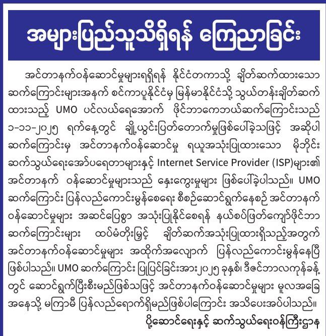 လာမယ့်ဒီဇင်ဘာလကုန်တွင် အင်တာနက်ဝန်ဆောင်မှုများ မူလ...