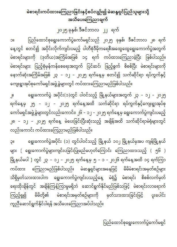 ပြည်ထောင်စုရွေးကောက်ပွဲကော်မရှင်(UEC)မှ ဒီဇင်ဘာလ ၂...